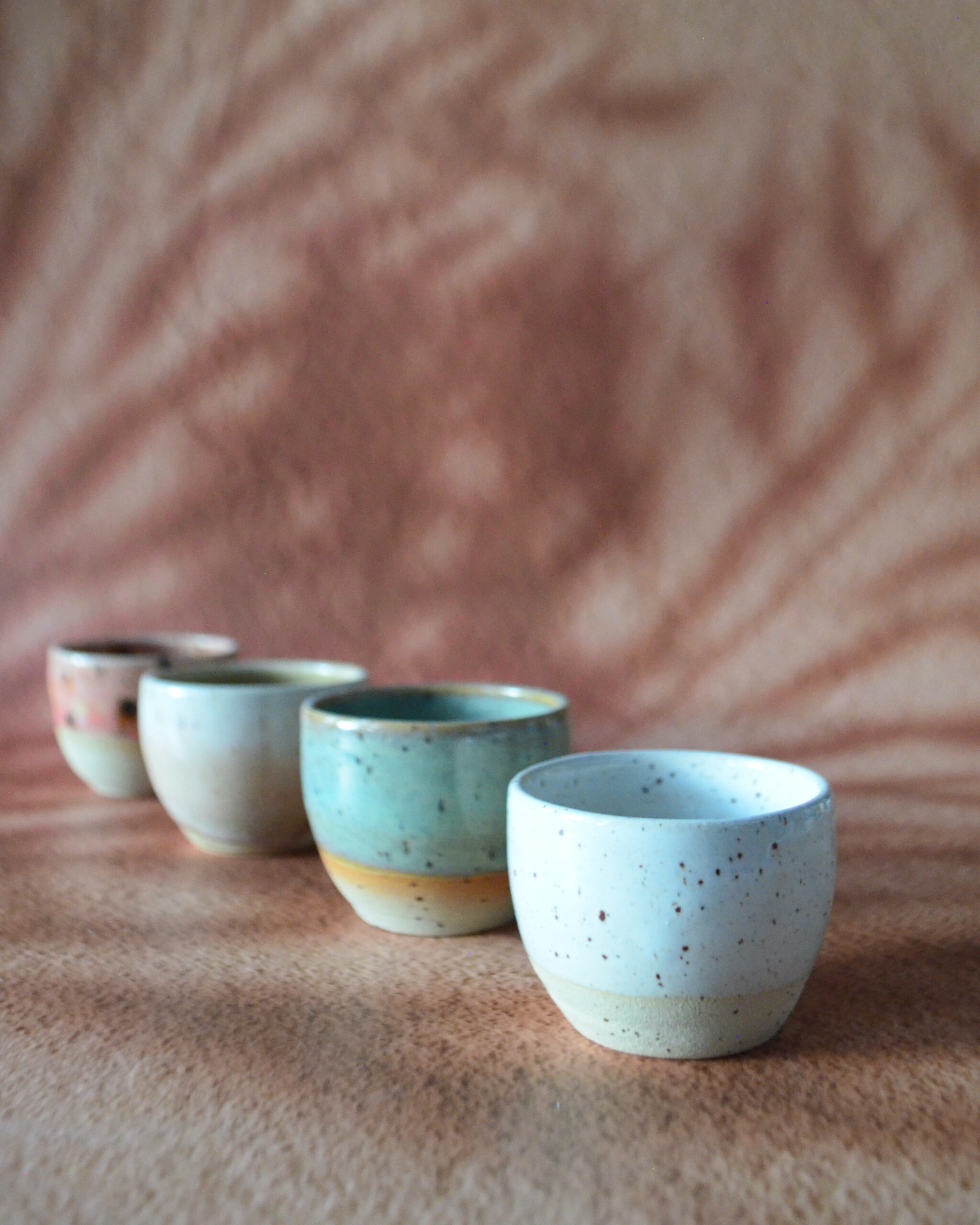 Ručne točená, dvakrát vypaľovaná šáločka bez uška, glazovaná krémovo bielou glazúrou na krásnej kameninovej, jemne bodkovanej hline.